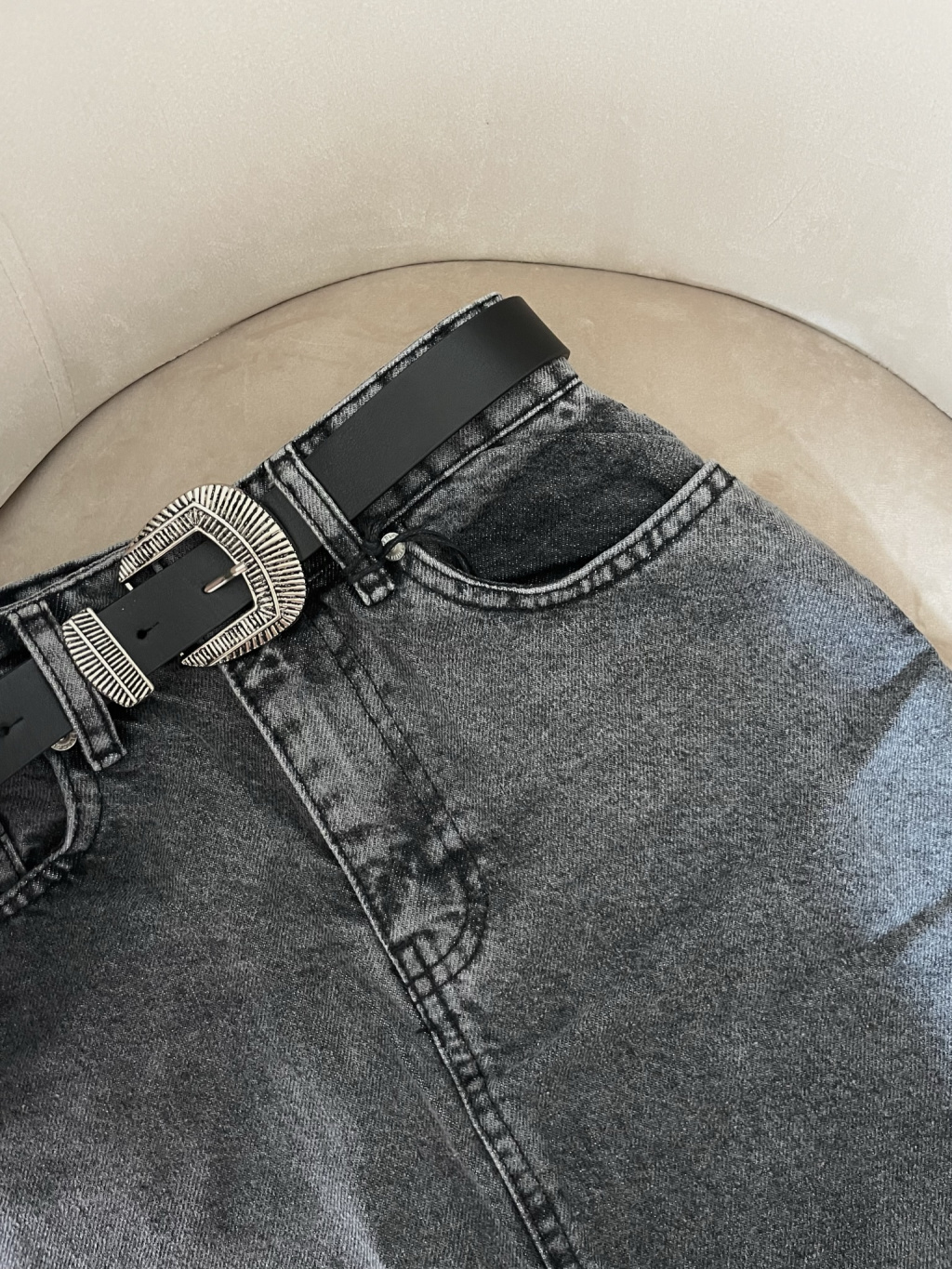 Stylová denim sukně v midi délce s rozparkem z šedé rifloviny.
