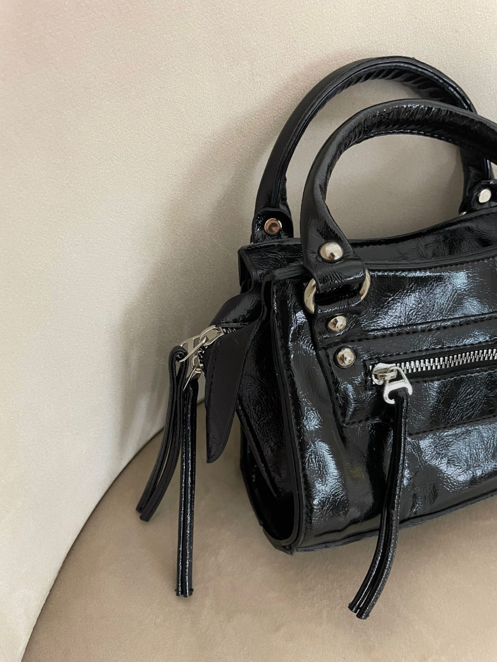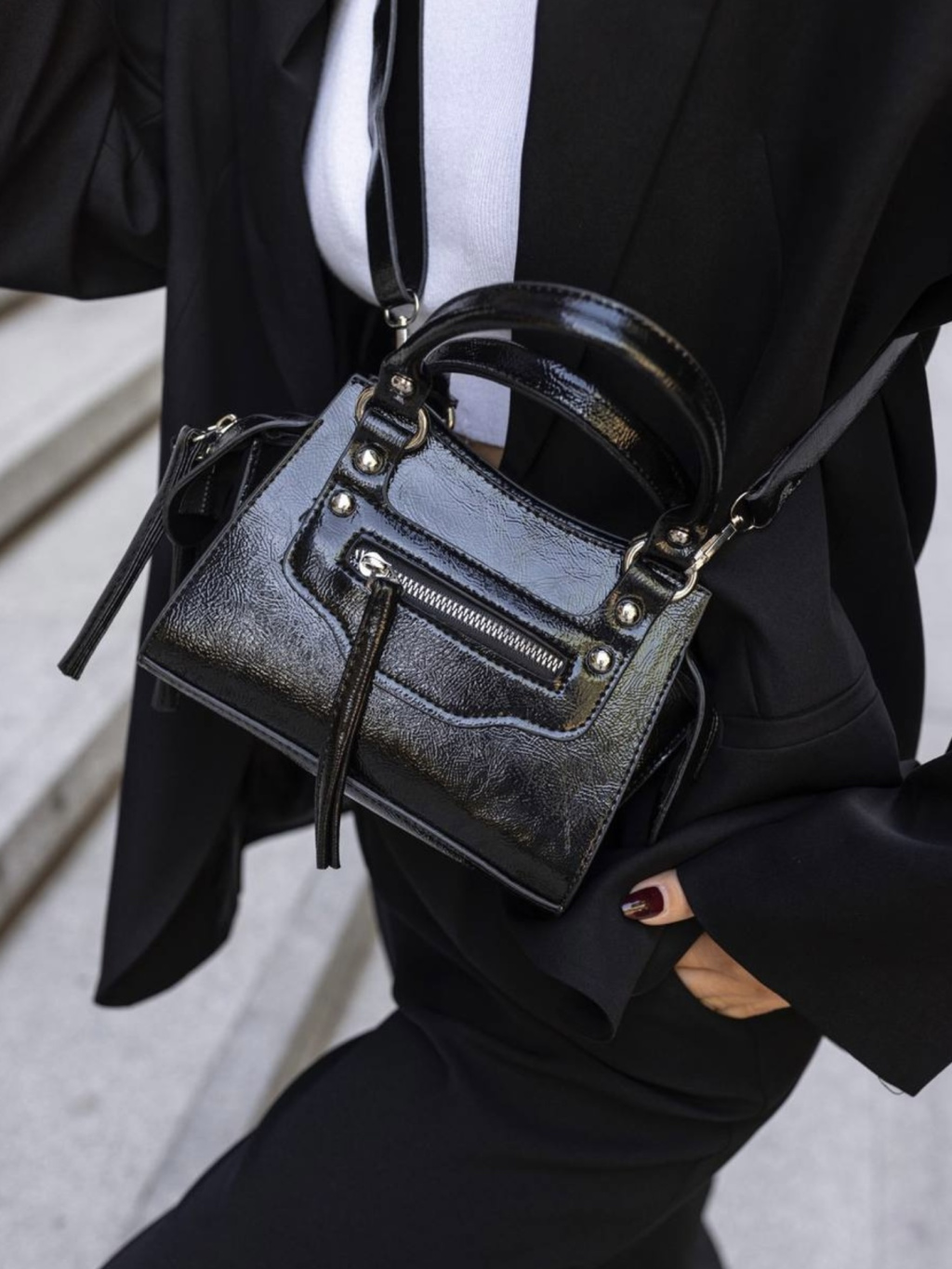Černá stylová kabelka se stříbrnými detaily vč. dlouhého crossbody popruhu.