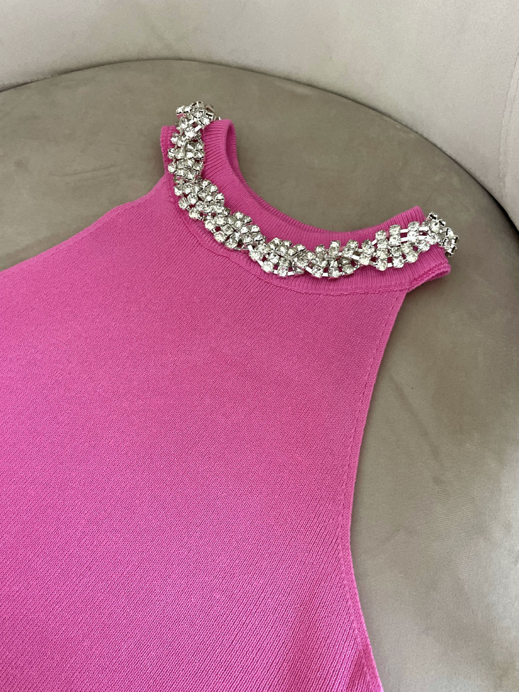 Luxusní žebrované šaty se štrasovou aplikací okolo krku a vázáním v pase. Pružný a kvalitní materiál, který se přizpůsobí každé postavě. Velikost je univerzální, sedí na XS-L.