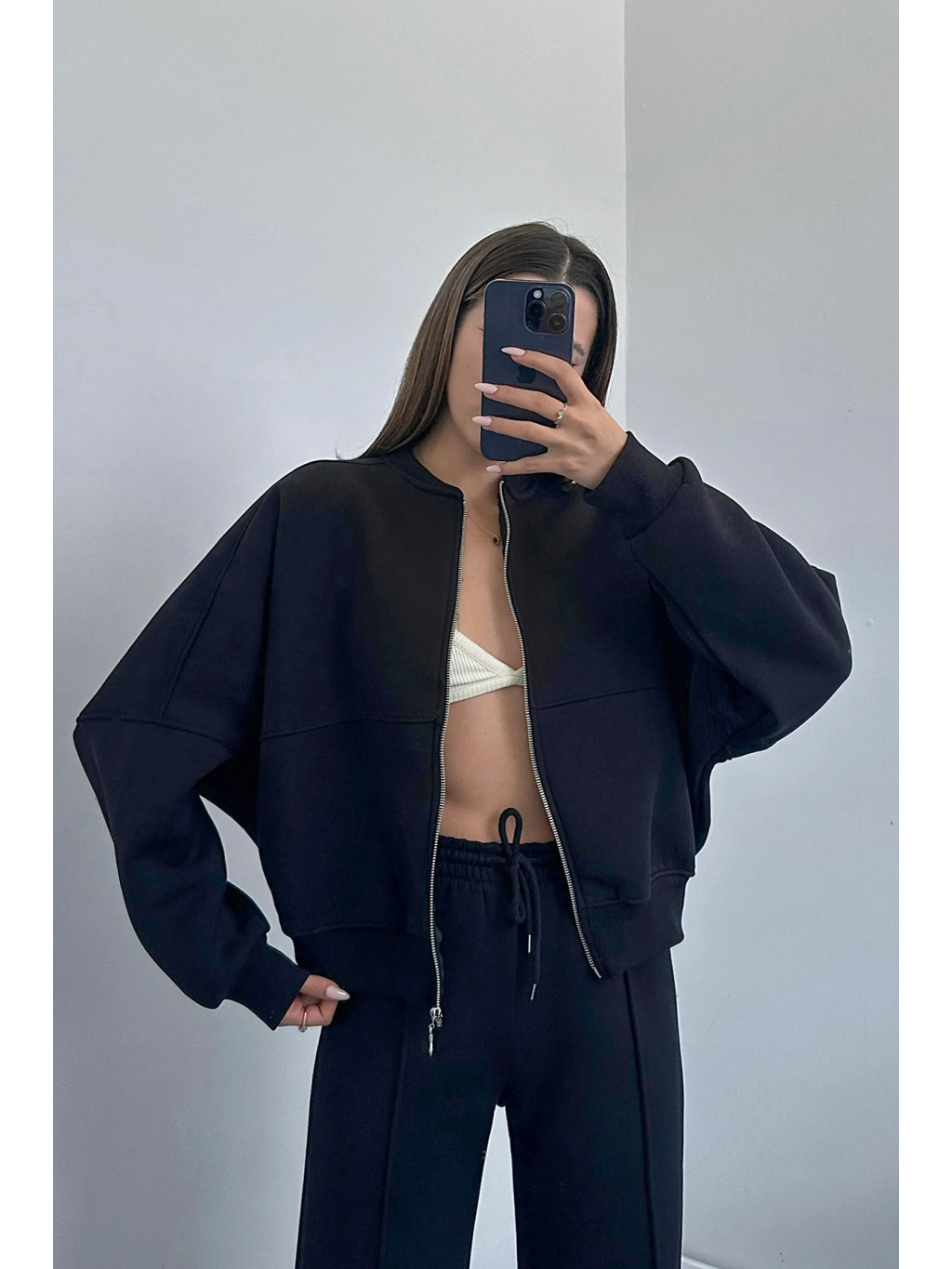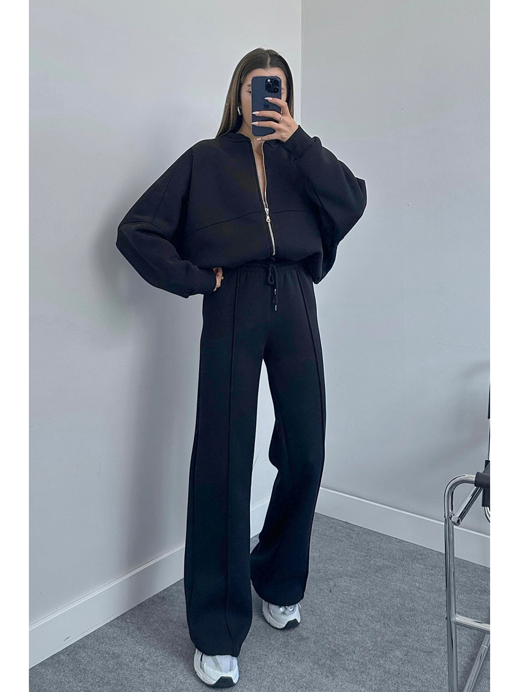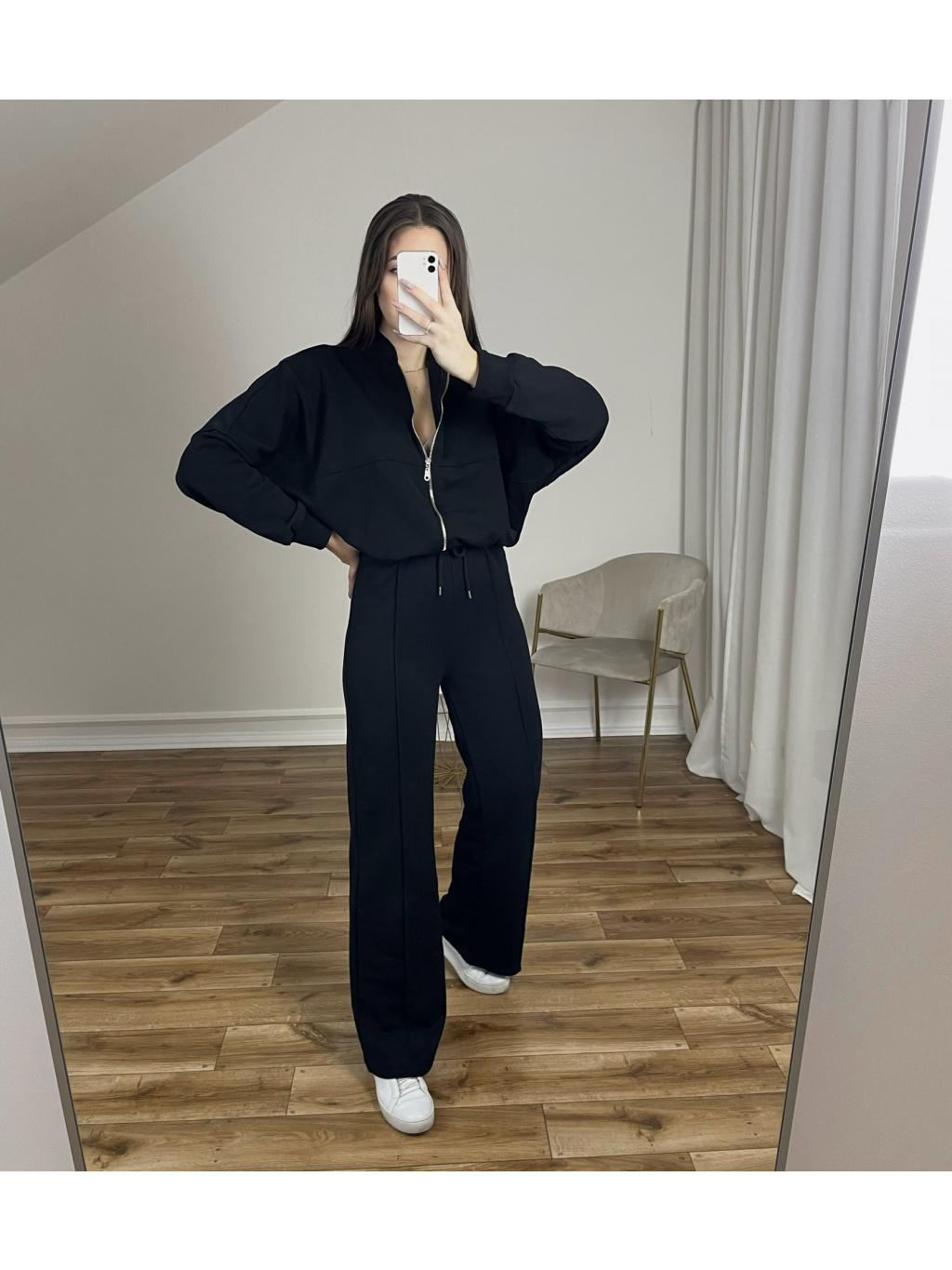 Stylová tepláková souprava. Volná mikina na zip a teplákové kalhoty s puky, které mají v pase gumu a jsou na vázání.